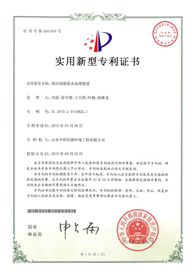 我司申請的“清潔制漿廢水處理裝置”于2015年8月5日獲得國家知識(shí)產(chǎn)權(quán)局頒發(fā)的實(shí)用新型專利證書。
